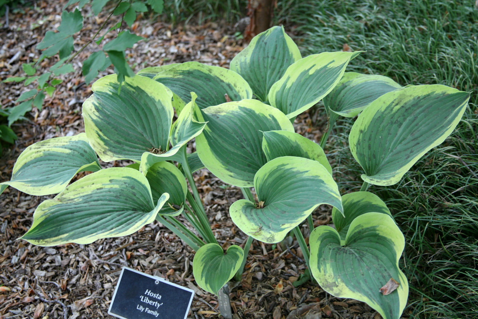 Хоста ‘Liberty’ — спорт от популярной хосты ‘Sagae’, выведена в США в конце 1990-х годов. Благодаря широкой золотистой кайме и отличным садовым качествам сорт быстро стал хитом. Он высоко ценится за стабильность окраски и зимостойкость.