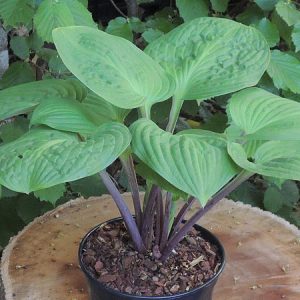 Высота 30-40 см (М)Листья плотные, зеленые с гофрированным краем. Изнанка листа белая. Черешки пурпурные.Цветы лавандовые.                                 Солнце-тень.Оригинатор: Jim Hawes/Pete&Jeam Ruh, 2005 г.