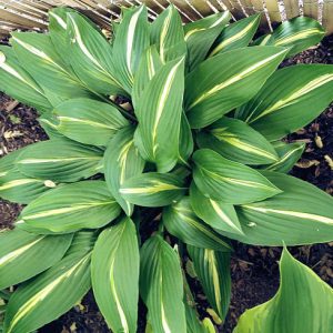Высота 20-25 см (Mini-S)Небольшие в форме сердца зеленые, немного глянцевые листья с узкой желтой каймой.Цветы лавандовые. Полутень.Спорт: H. Silver Threads and Gold Needles. Оригинатор: Gino Vandekinderen.