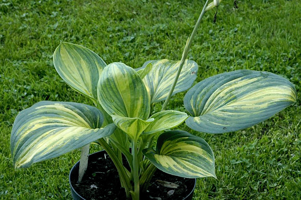 Высота 25-30 см (М)Листья очень плотные, восковые, сине-зеленые с широкой желтой каймой, летом кайма становится кремово-белой.Цветы лавандовые. Тень-полутень.Спорт: First Frost. Оригинатор: Walters Gardens/Hans Hansen,2009 г.
