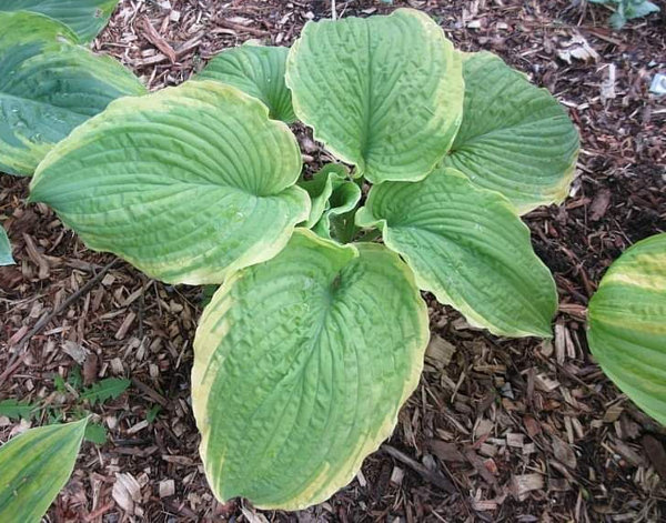 Высота 25-30 см (М)Листья очень плотные, восковые, сине-зеленые с широкой желтой каймой, летом кайма становится кремово-белой.Цветы лавандовые. Тень-полутень.Спорт: First Frost. Оригинатор: Walters Gardens/Hans Hansen,2009 г.