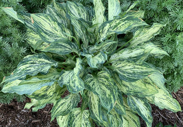 Новинка! Листья необычные, волнистые, пестрые с зелеными пятнами. Весной они наиболее белые, а по мере роста появляются более выраженные зеленые пятна. Эффектный сорт!
