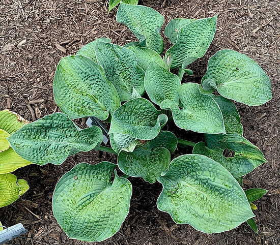 Высота 55-60 см (L)Большие круглые, морщинистые, чашевидные, плотные листья сине-зеленого цвета с тонкой шартрезно-кремовой каймой.Цветы почти белые, ароматные. Тень-полутень.Спорт: H. Abigua Drinking Gourd. Оригинатор: M.StrandbergПереводится Черника с мороженым.
