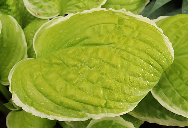 Лист средней плотности, сильно выпуклый. Весной окраска лимонно-желтая, летом приобретает зеленцу, по краю листа белая кайма. Одна из самых ярких хост весной. Скорость роста-умеренная.