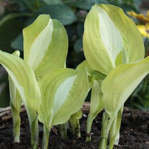 Высота 40-45 см (M)Весной листья красивого яблочно-зеленого цвета, с четкой кремово-желтой каймой, во второй половине лета центр становится светло-желтым, а край ярко-белым. Сочетание совершенно уникально. Листья имеют плотную структуру и приятный блеск. Средний рост.Цветы: Лавандовые. Полутень/тень.Оригинатор: Naylor Creek Nursery