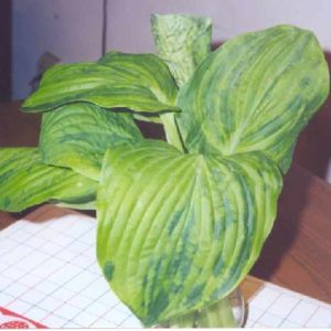 Высота 60-65 см (L)Листья желто-зеленые с темно-зеленой каймой. Край слегка волнистый. Быстрая скорость роста.Цветы лавандовые. Полутень-теньСпорт: H.Sguash Casserole Оригинатор: Hans Hansen/Shady Oaks, 2005 г.